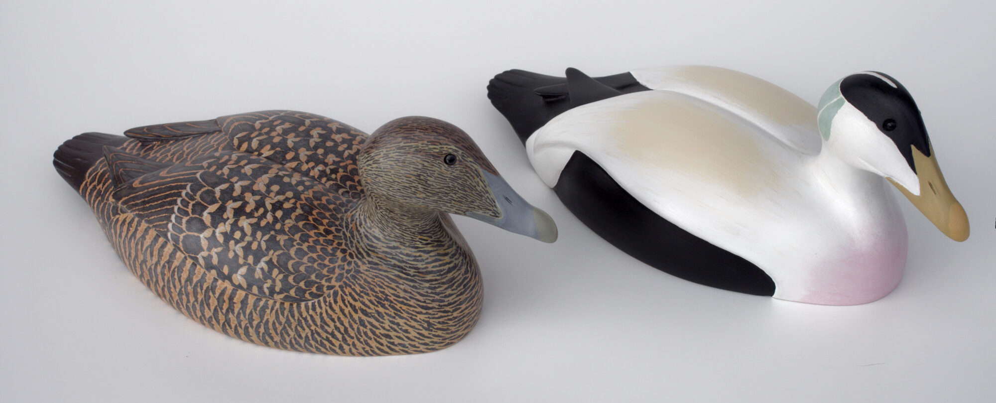 Ederfuglepar. Da jeg som ung første gang blev opmærksom på fugle i kunsten, var det Johannes Larsens træsnit Ederfuglepar der gjorde et stor indtryk på mig. Siden har jeg lavet ederfugle på mange forskellige måder, og må nok erkende, at hvis jeg skulle have en signatur fugl, skulle det være en ederfugl. Så det kom ikke bag på mig, da jeg gik igang med at lave 2 ederfugle par, et der svømmer og et der flyver, i næsten fuld størrelse.